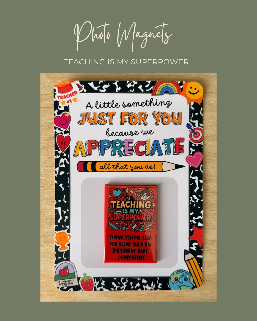 These personalized photo magnets can brighten up any fridge, locker, or workspace. A fun and thoughtful way to say thank you to the amazing teachers who inspire us every day.